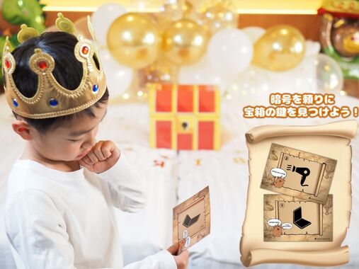 紙に書かれた暗号を辿り、お部屋の中に隠されたカギを探し出す、ドキドキわくわくトレジャーハント☆ 宝箱の中には、お宝(お菓子)がザクザク!!